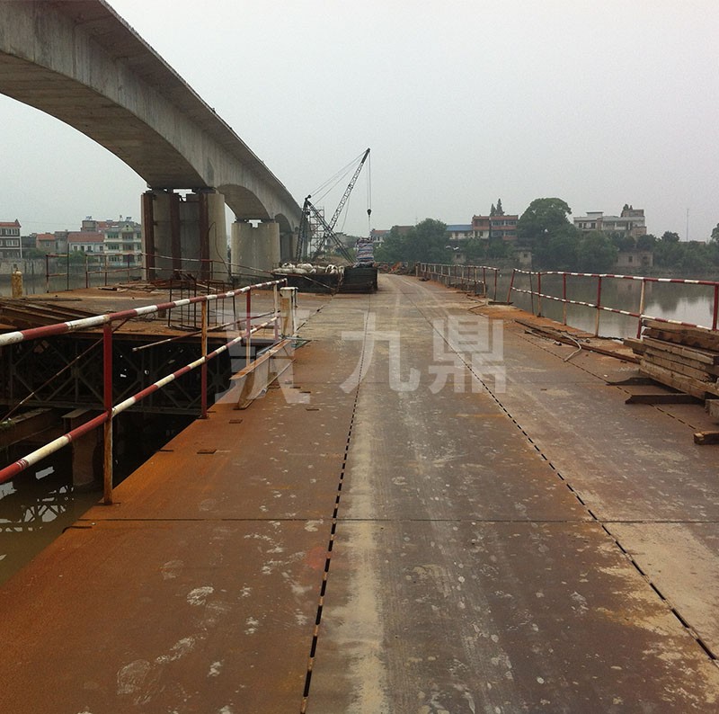 贝雷桥能根据实际需要的不同跨径组成各种类型和各种用途的临时桥,贝雷桥由桁架式主梁、桥面系、链接系、构属四部分组成,并配有专门的架设工具,大跨径可达69米,车行道宽度3.7米;由上、下弦杆、竖杆及斜杆焊接而成,上下弦杆的端部有阴阳接头,接头上有杵架连接销孔。